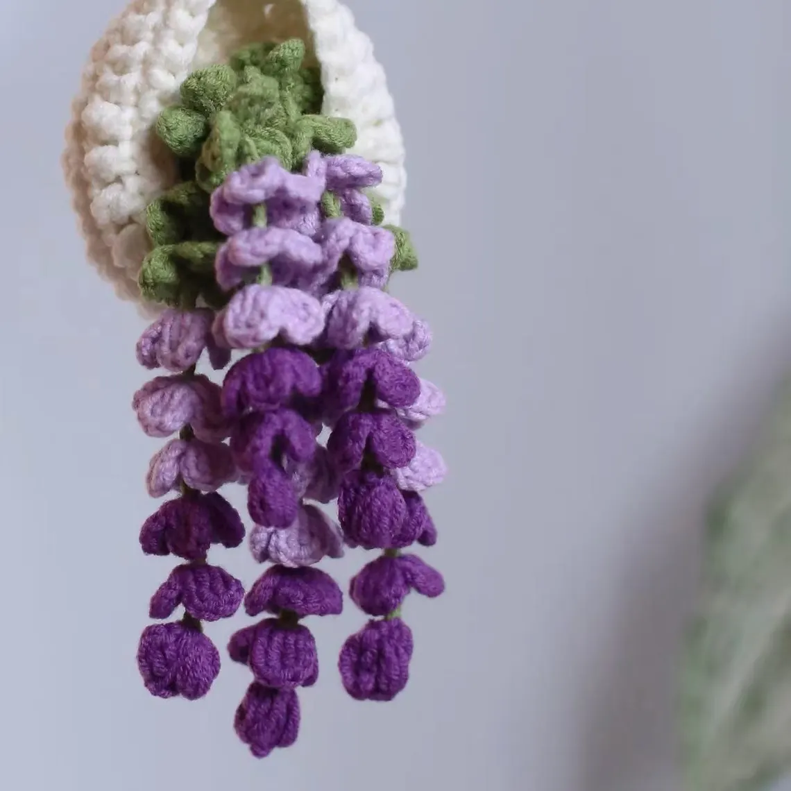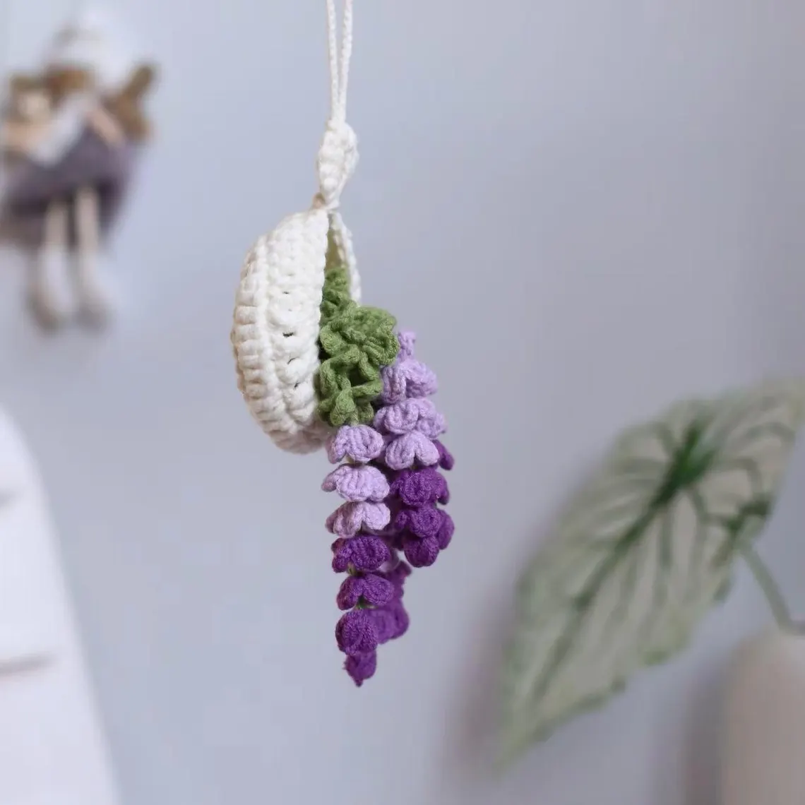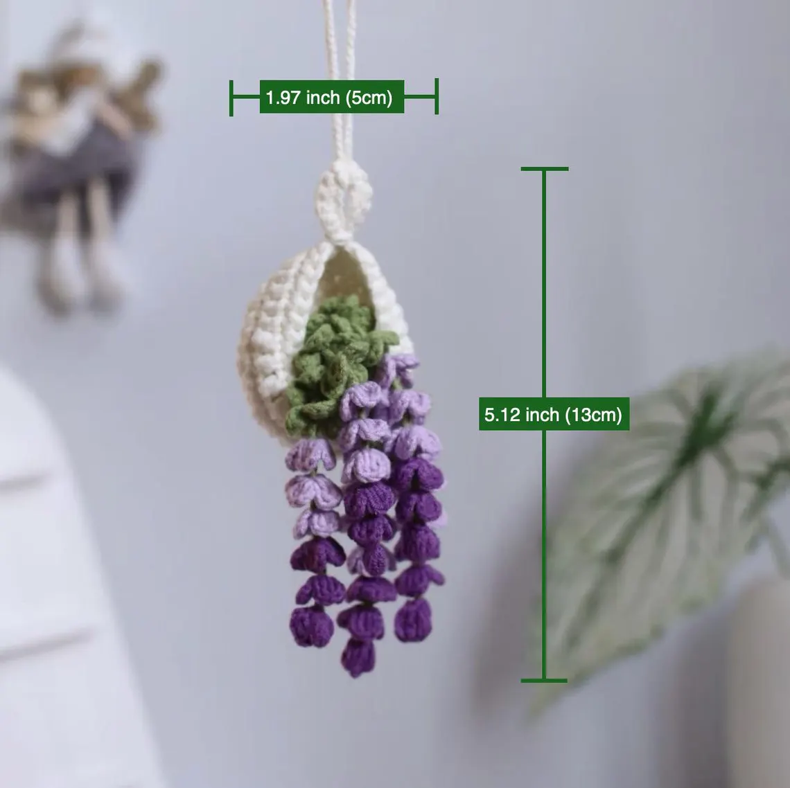 The little crocheted basket sits at the top, green leaves peeking out, with clusters of tiny bobble-like flowers tumbling down beneath it. It has that cottagecore, botanical vibe that fits just about anywhere, a rearview mirror, a sunny window, a desk corner, a bedside table, or hung on a wall as a soft little accent.