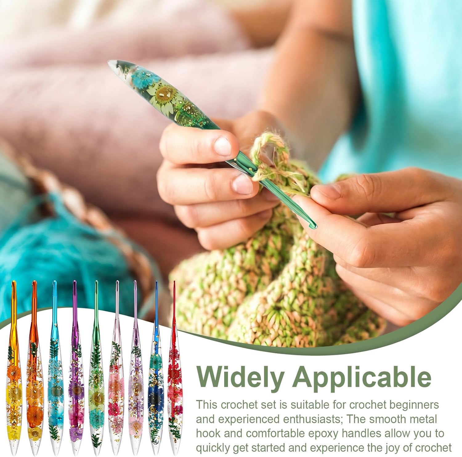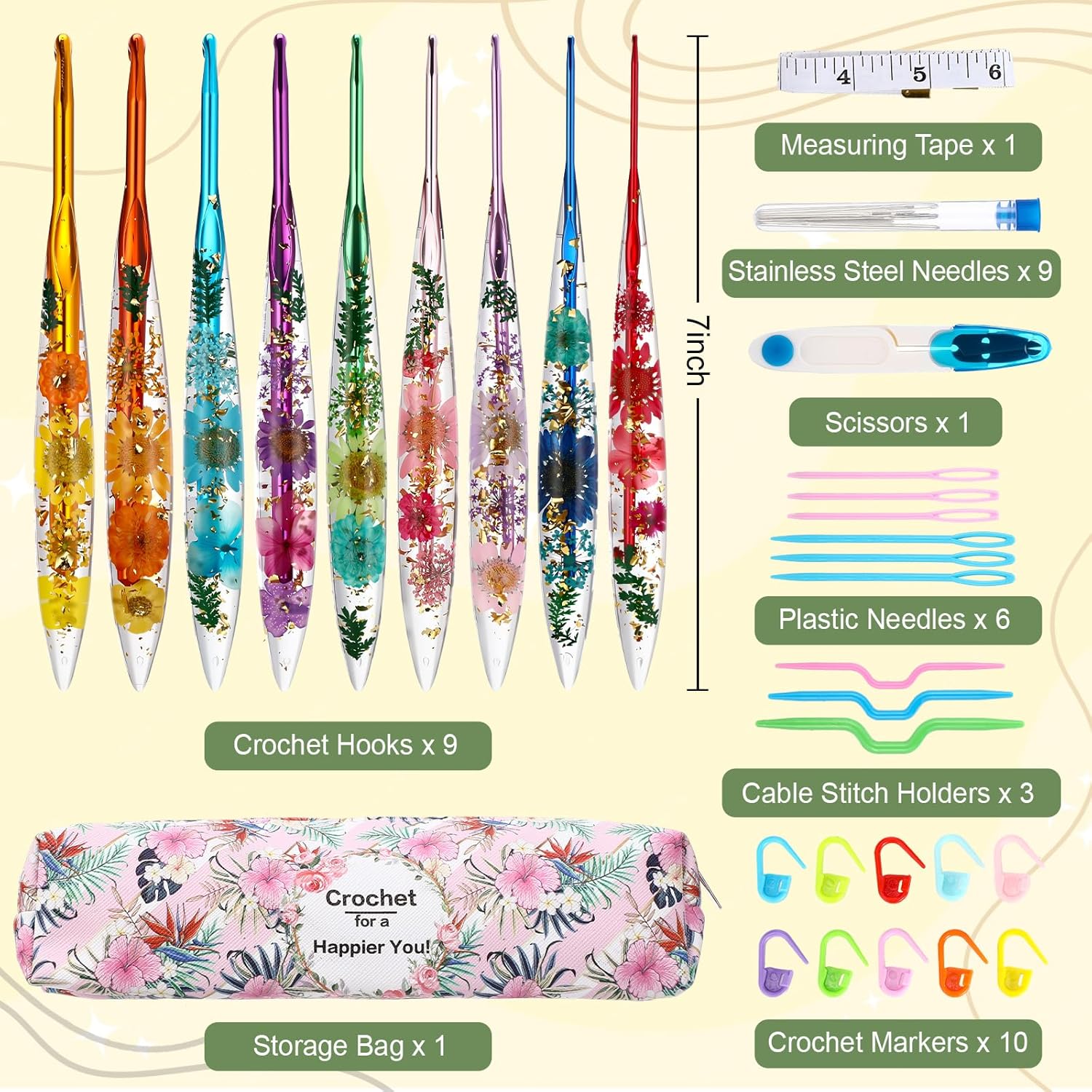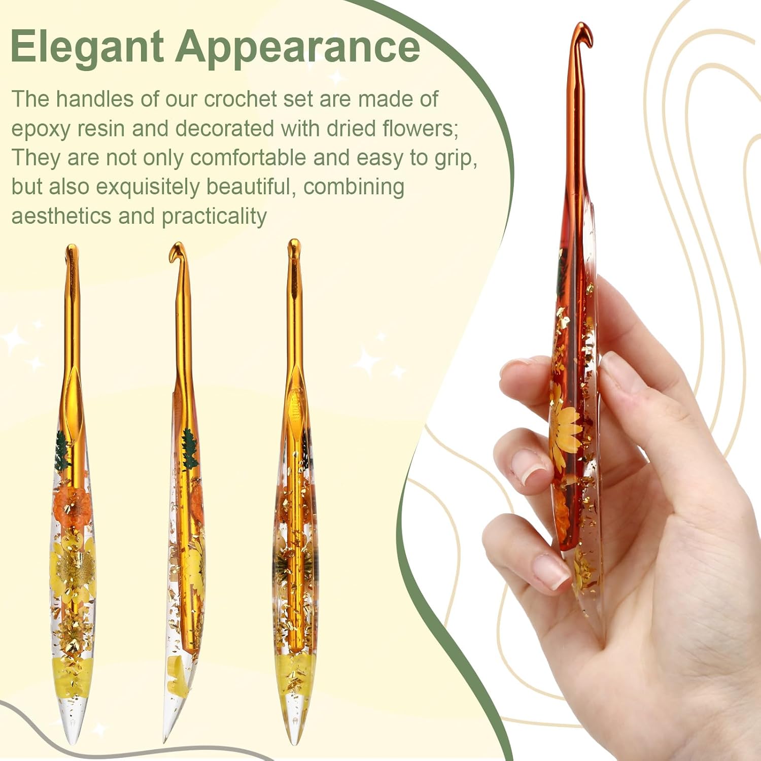 The hooks measure approximately 7 inches long and feature comfortable epoxy resin handles decorated with gorgeous, real dried flowers. The ergonomically designed grip helps reduce hand fatigue during longer crochet sessions, which makes a real difference when you’re working on bigger projects.