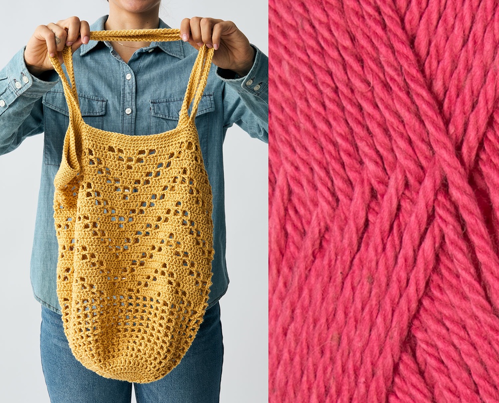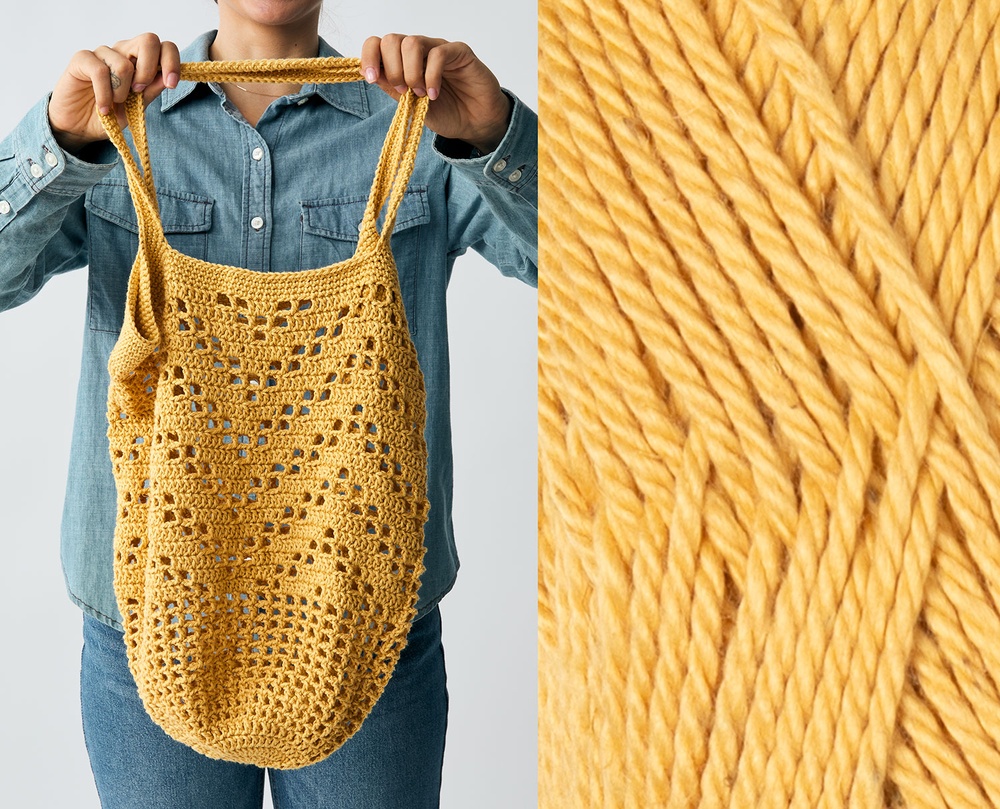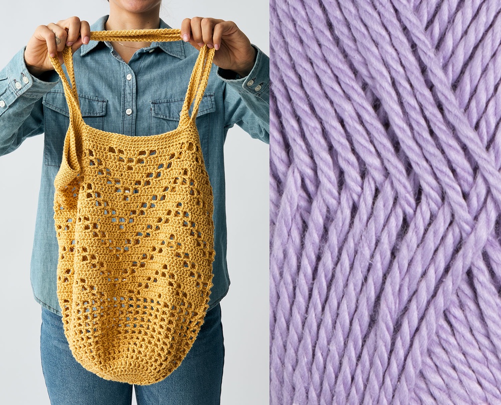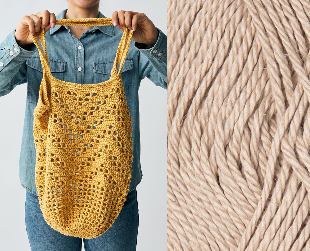 The kit comes with 4 skeins of DillyDally DK, a plant-fiber blend made from 70% Pima cotton, 20% bamboo, and 10% hemp. That combination means it’s soft against your hands while you work, and the finished bag has a nice drape and sheen with real structural strength for hauling groceries, beach gear, or a few crochet projects.