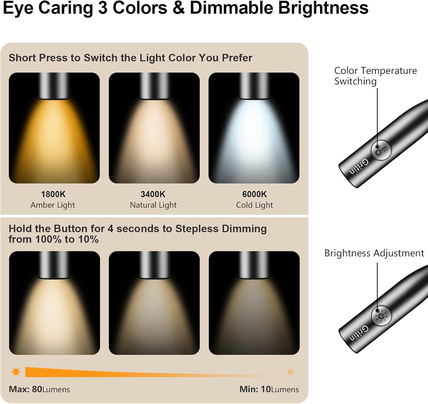 The three color temperatures, amber 1800K, warm 3400K, and cool 6000K, let you set the mood anytime. Stepless dimming fine-tunes the brightness, keeping your eyes comfy during long chapters or delicate stitches.
