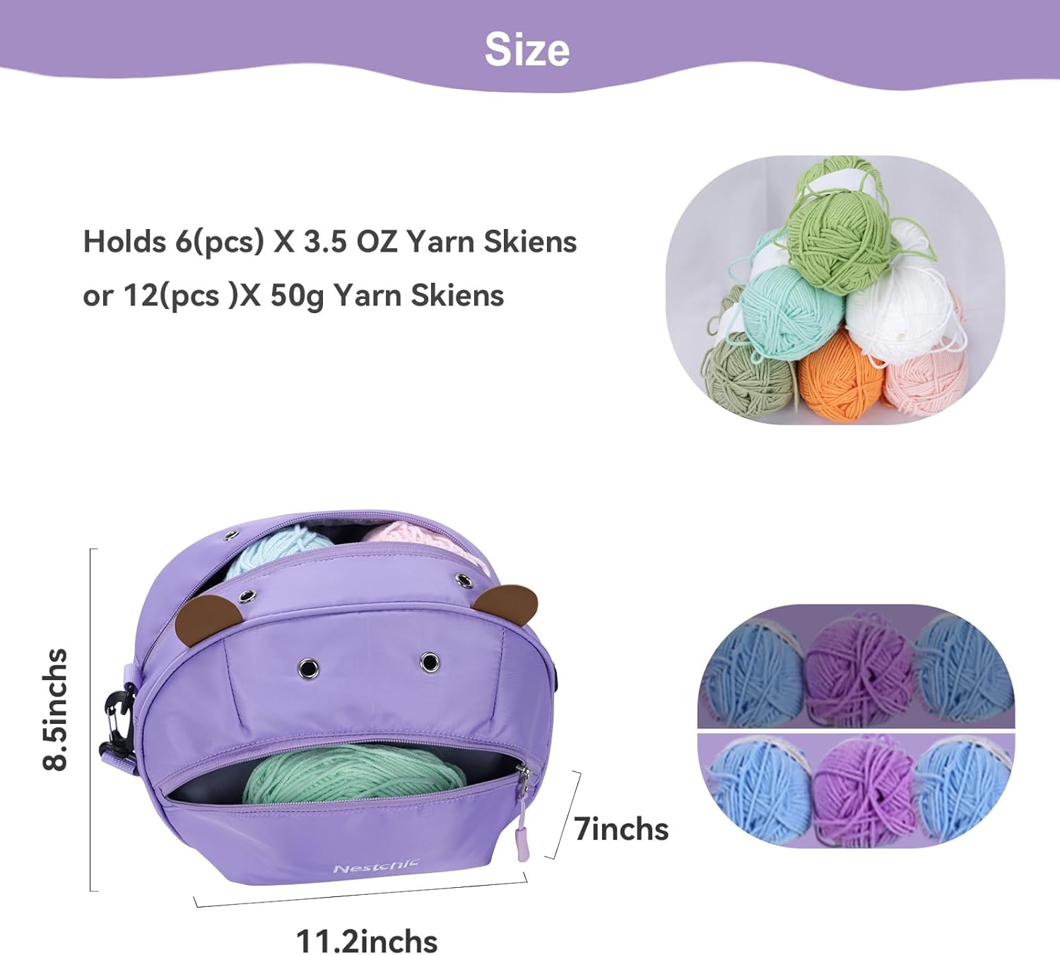 The bag measures 11.42 by 6.69 by 8.26 inches and features four stainless steel grommets that let your yarn feed through smoothly without getting caught or twisted. The main compartment holds six 3.5oz skeins or twelve 50g skeins, so you’ve got room for a decent-sized project.