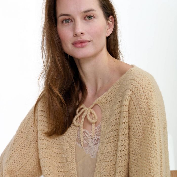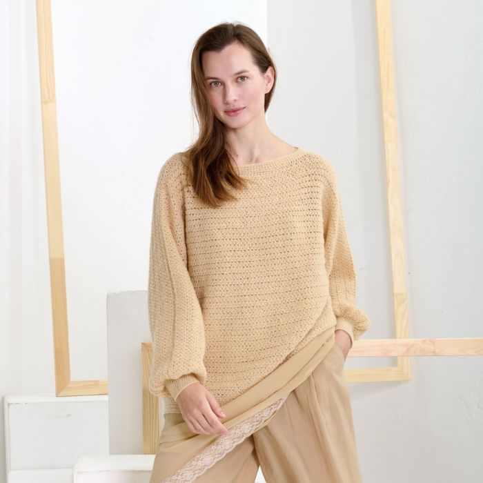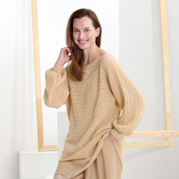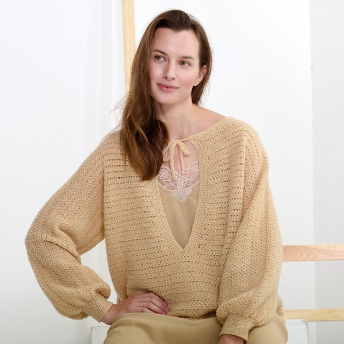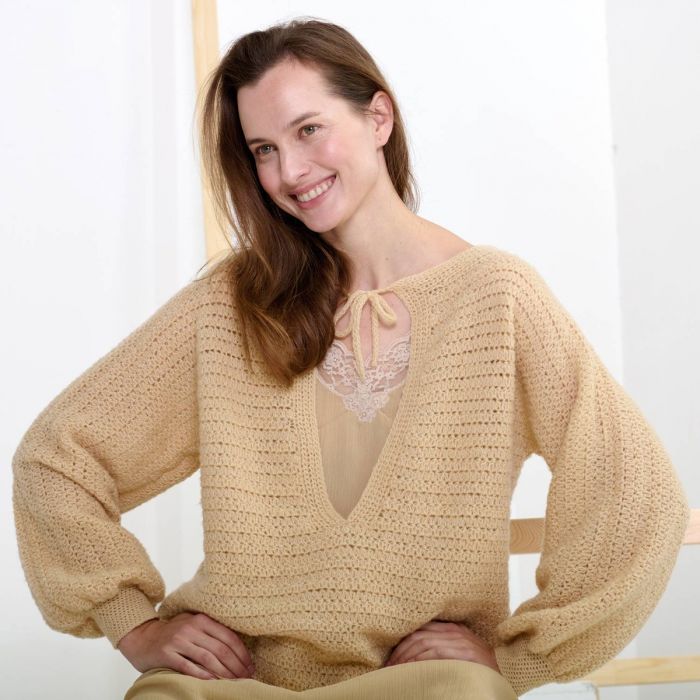 This V neck sweater crochet pattern is a total gem for your fall and winter wardrobe. With its teardrop neckline and gently puffed sleeves, it’s the kind of cozy-chic piece you’ll reach for again and again. It drapes beautifully and has just the right mix of relaxed and polished, making it perfect for everything from casual days to a dinner out.