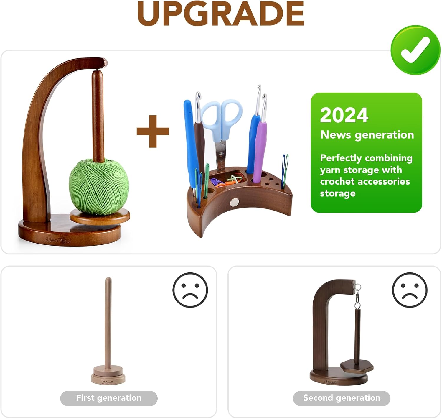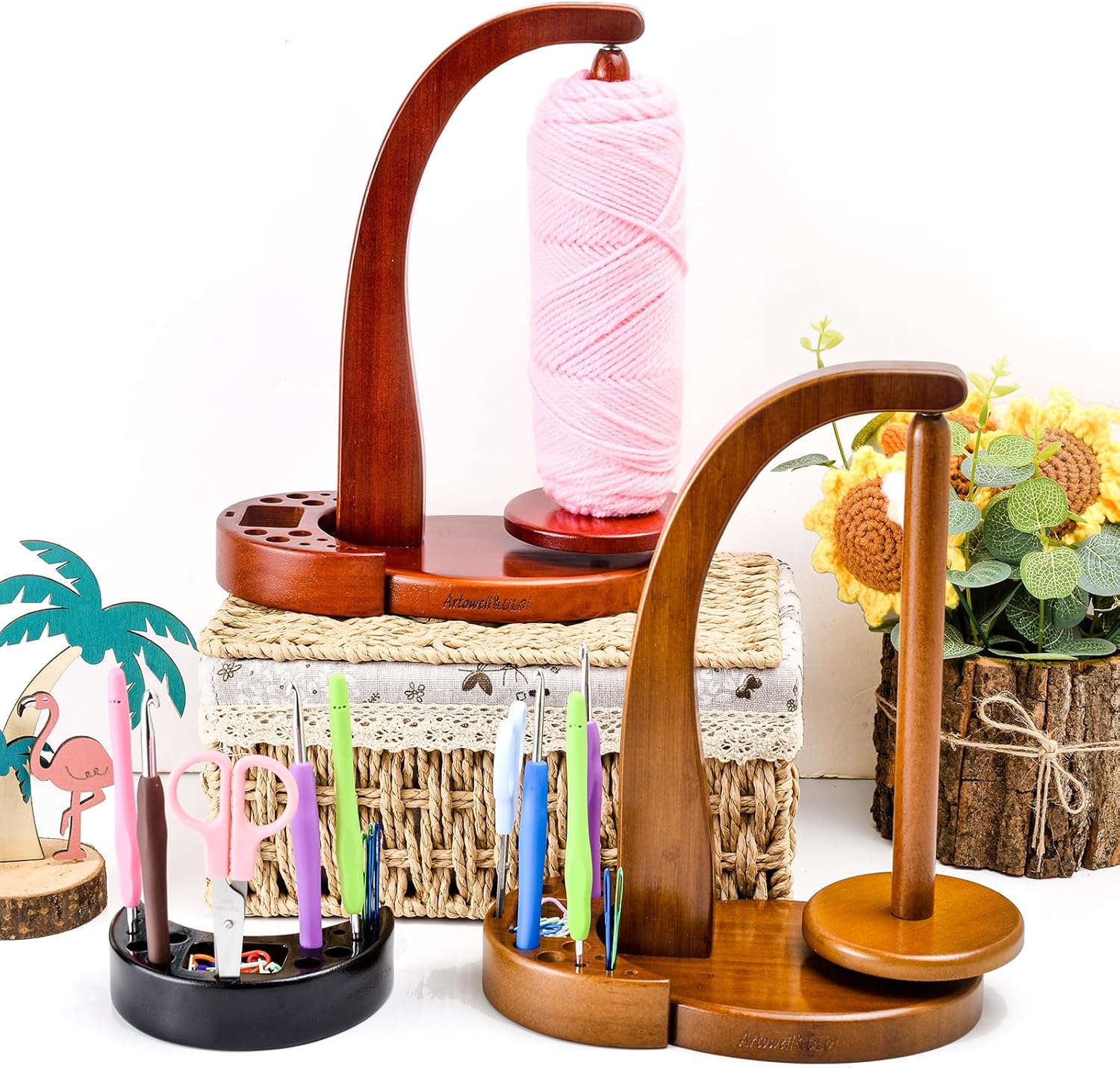 A wooden yarn holder for crocheting that actually does more than just hold your yarn, this one has a built-in tool caddy around the base so your hooks stay right where you need them. No more hunting around your project bag mid-row.