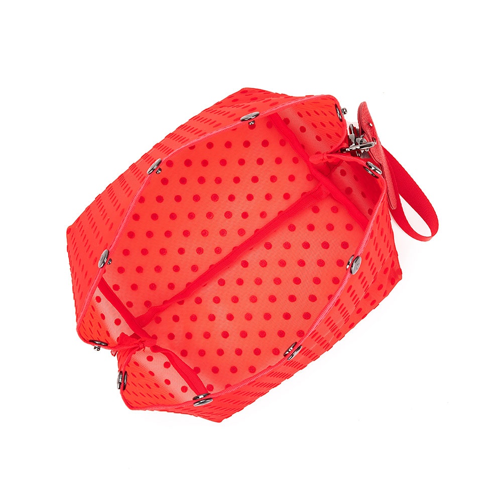 This Valentine's Day project bag features festive red mesh with polka dots and a heart-shaped needle charm. The snap-top keeps multiple strands tangle-free while you work.